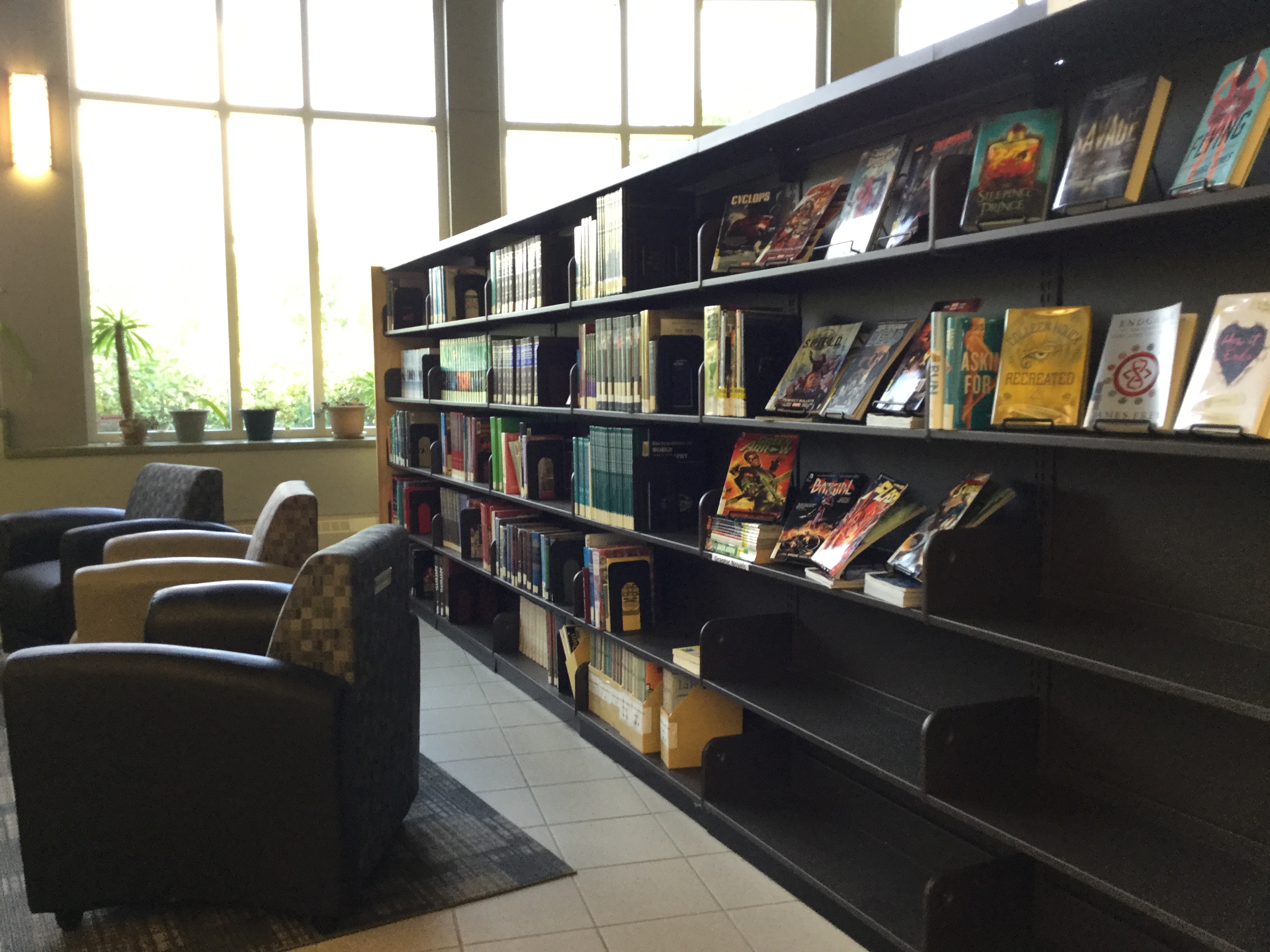 At Erin DHS, we have an unique partnership to share the space with the Erin community which is great for everyone as we have nursery school students mixed with seniors mixed with our teens every day. It also means that the T-L has to collaborate with the community librarians to organize the space. It means we have an amazing collection, far beyond that of typical high schools: our T-L tends to focus more on non-fiction sources while the community library caters to their largest demographic of users  by purchasing a lot of young adult fiction. Another benefit: resources can be pulled in from every other branch in the Upper Grand DSB as well as Wellington County. Many of our students are bussed in from 3 different counties, so one of the first things I do is arrange for all of my students to get a Wellington County library card so that they can access all of the resources. The partnership works to cull the collection frequently: there’s always a table in the back corner for discards that are free to the community (often full of hardcover fiction and a few non-fiction books, some media).