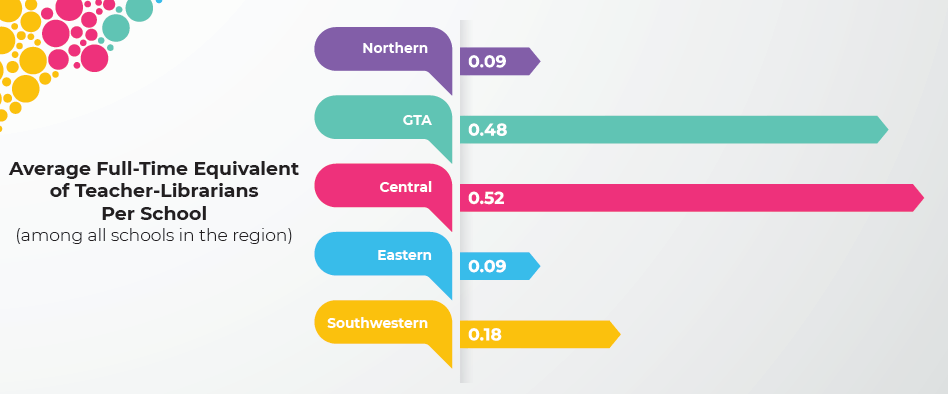 Many elementary schools – and smaller secondary – function with part-time staffing, meaning that their school library is closed for part of the day. Alternately, many school boards are staffing libraries with librarian technicians, staff who do not have the same teaching background as teacher-librarians. In fact, in rural jurisdictions, this problem is exacerbated as many jurisdictions are staffing elementary school libraries solely with library technicians: in Northern Ontario, 58%; Eastern Ontario, 67%; Southwestern Ontario, 49%; Central Ontario, 17%; GTA, 14% (OSLA Infographic, Data from 2019 Statistics Courtesy of People for Education). In many jurisdictions, the average staffing levels of teacher-librarians do not add up to one full time teacher-librarian, as seen in the following graphic: